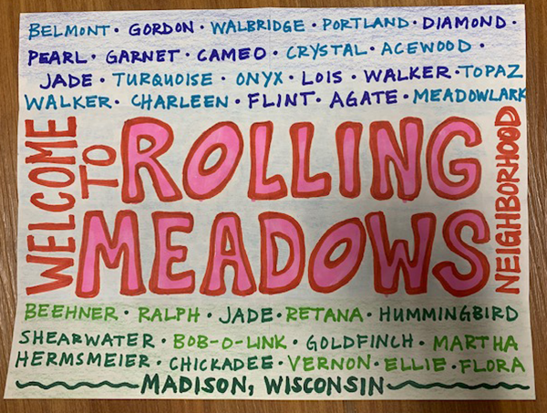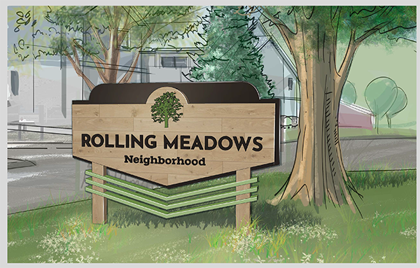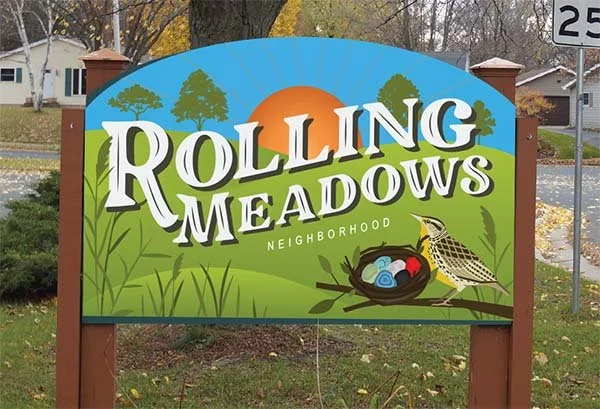 The Rolling Meadows neighborhood sign at Acewood Avenue on the north side of Cottage Grove Road was recently destroyed during a car accident. The Rolling Meadows Neighborhood Association is organizing efforts to replace the sign.